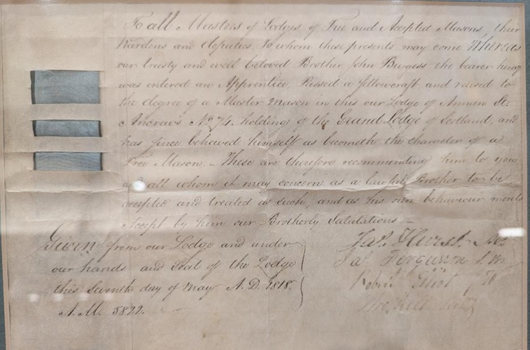 My current thoughts are that John Burgess had this membership document created for his trip to America with his family.  He obviously was instructed as to the importance of Masonic Documentation when traveling.  He ended up immigrating through Pennsylvania and finally settling in the state of New York in the 1830’s.