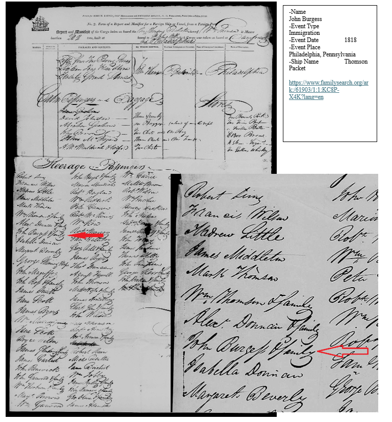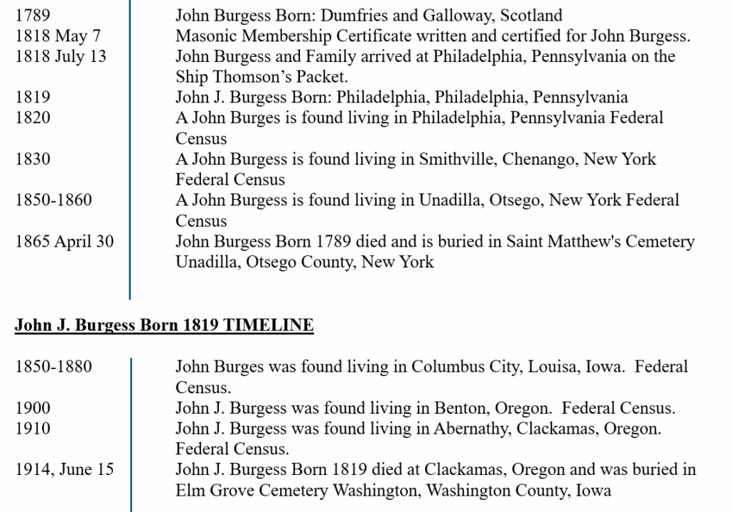 There is still Masonic research that needs to be done in Philadelphia and New York to see if a John Burgess in 1819 – 1830’s joined a Masonic Lodge.  More to come on this if anything surfaces.